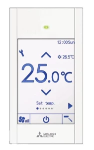 The stylish touchscreen controller model PAR-CT01MAA-SB from Mitsubishi Electric is a hardwired controller that can be used with M series and Mr Slim indoor wall mounted units. This easy-to-use touchscreen controller features a backlight display and can be configured via the Mitsubishi app, full details on the PAR-CT01MAA-SB hardwired controller can be found in the brochure below.